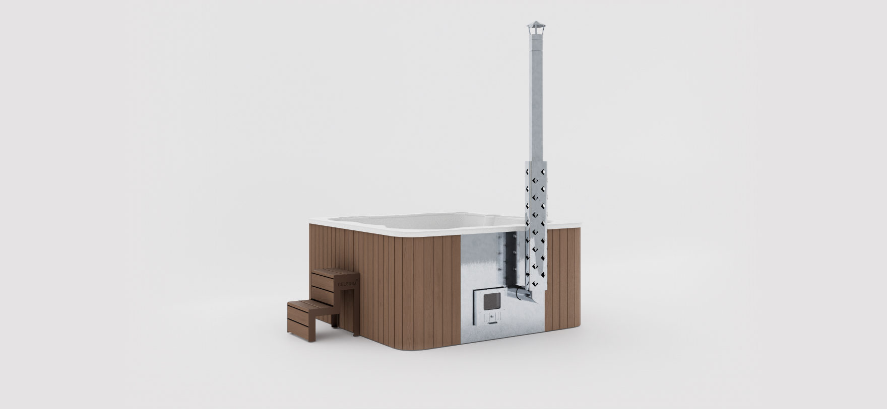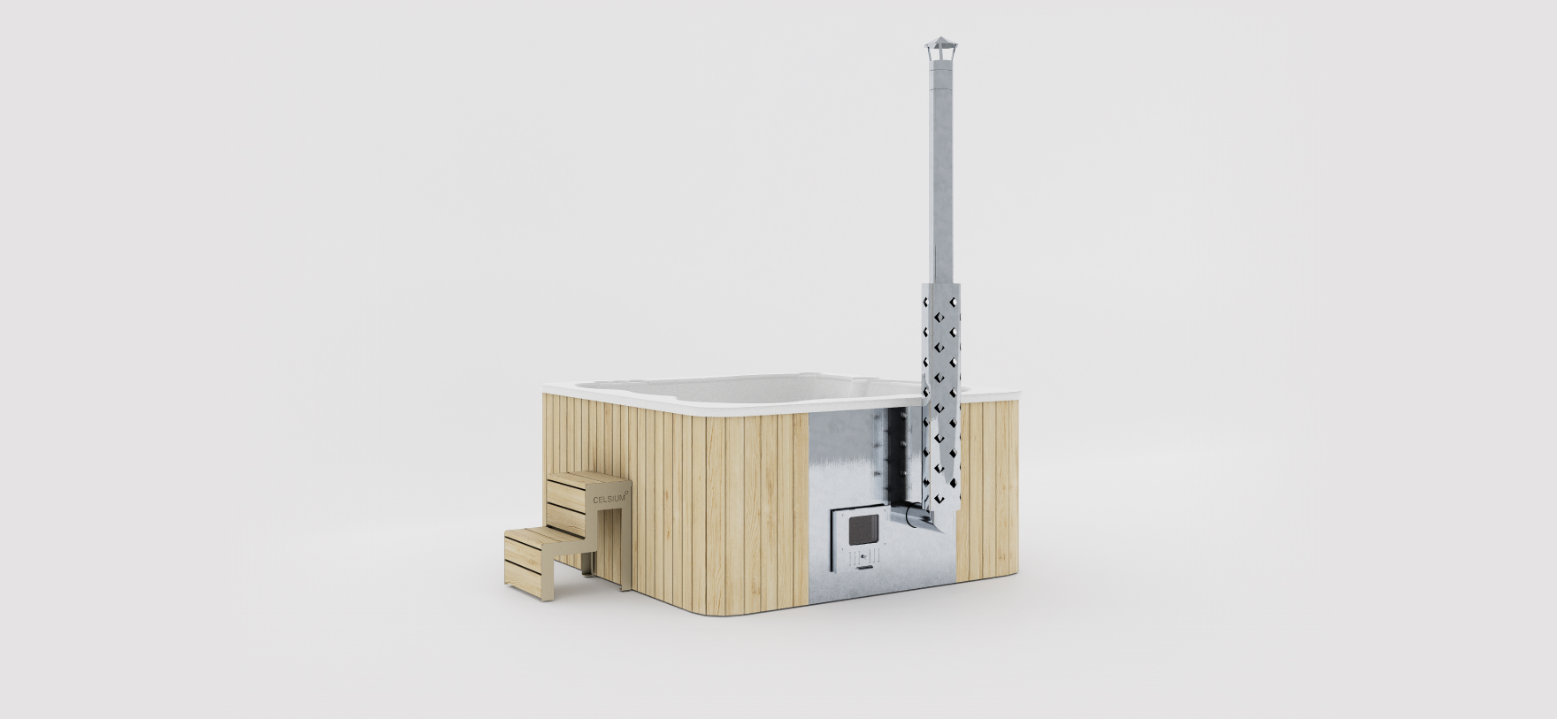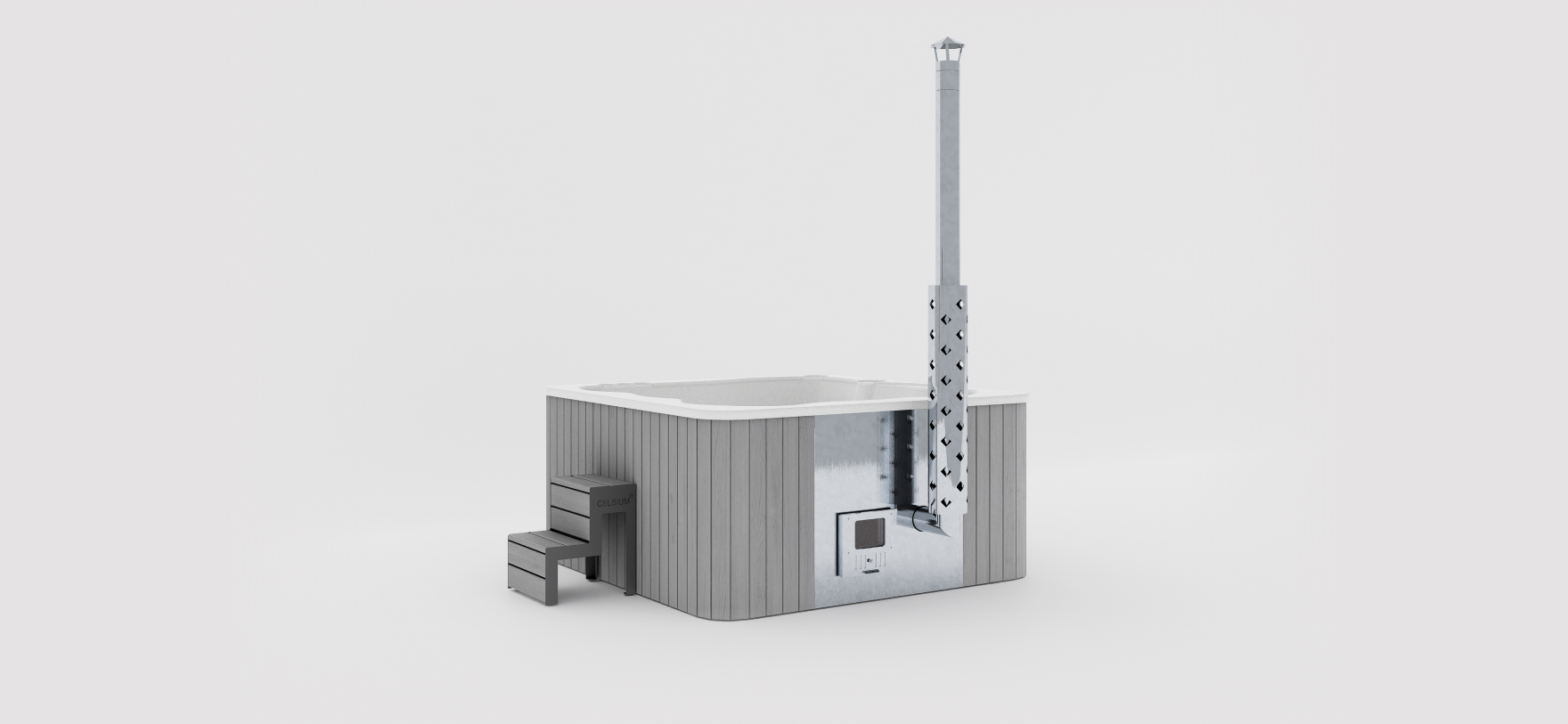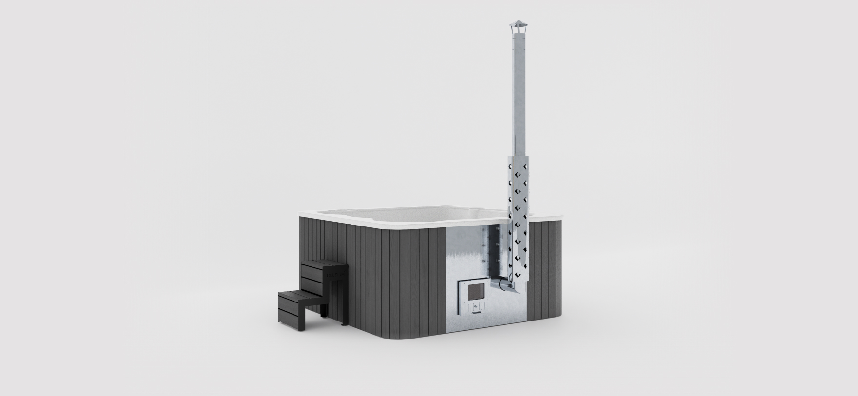 一体型ヒーターを内蔵した正方形のホットタブ。デザイン性と機能性のバランスが取れています。