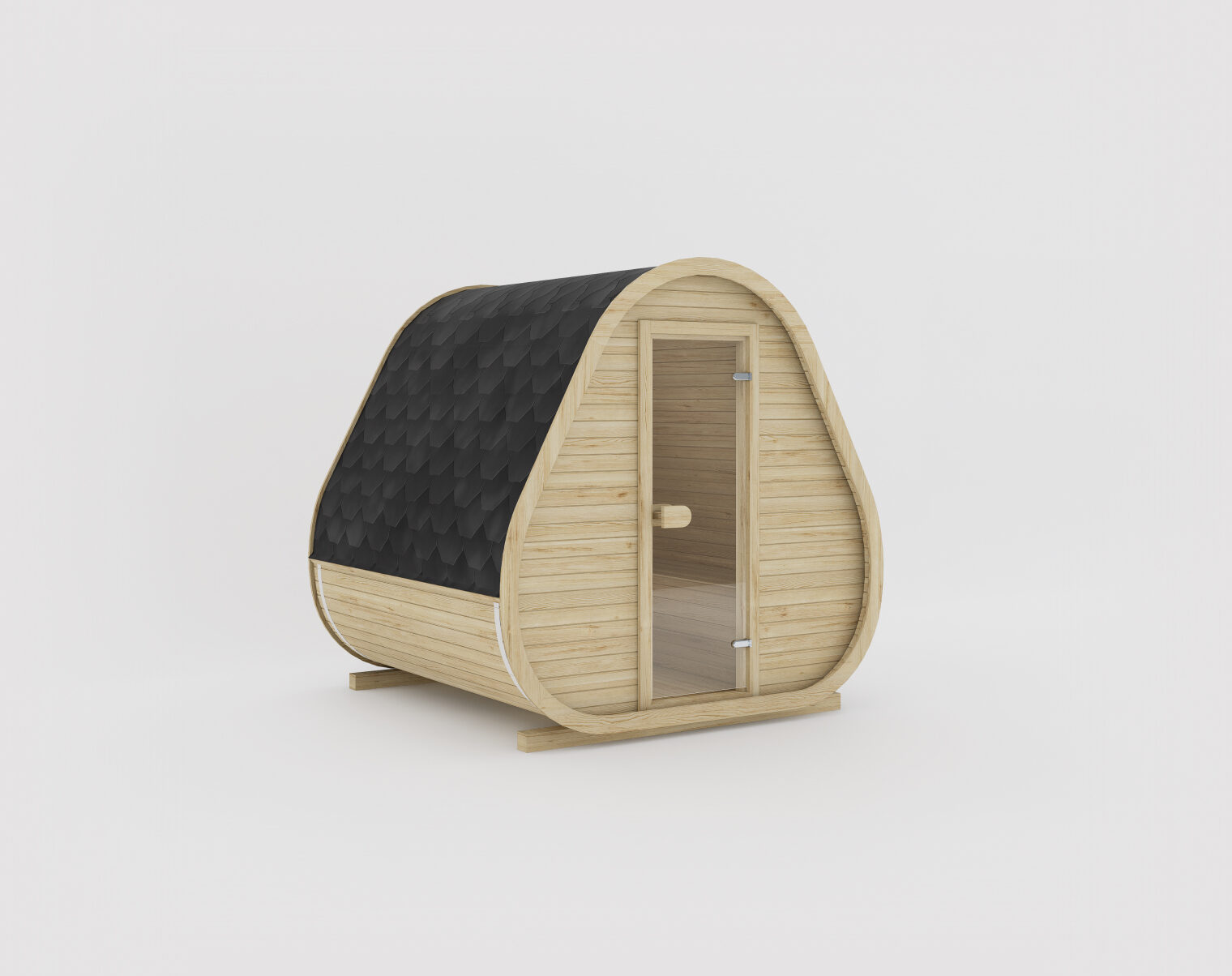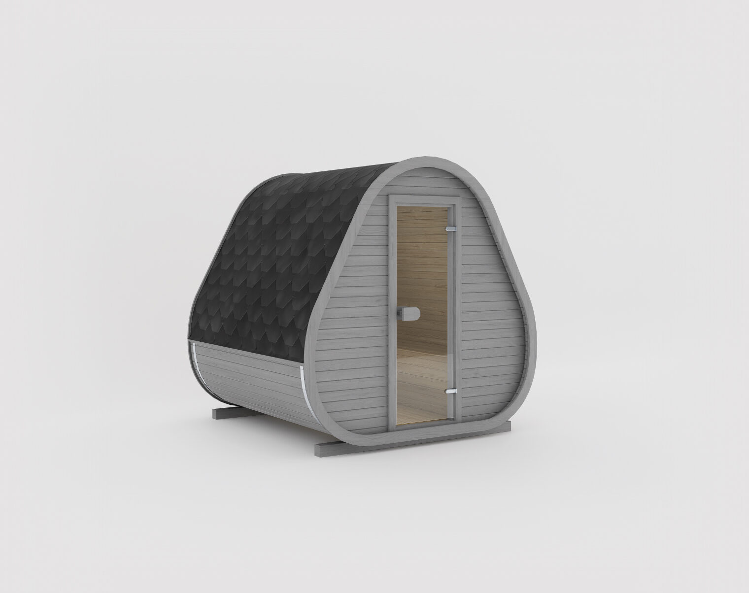 The Classic model features a compact, rounded triangular design, seamlessly blending modern style with classic aesthetics. Its clean lines and minimalist form create a striking, yet functional structure, perfect for those seeking a stylish and efficient sauna without additional external elements. For added shelter or functionality, see Herkus Grand model.