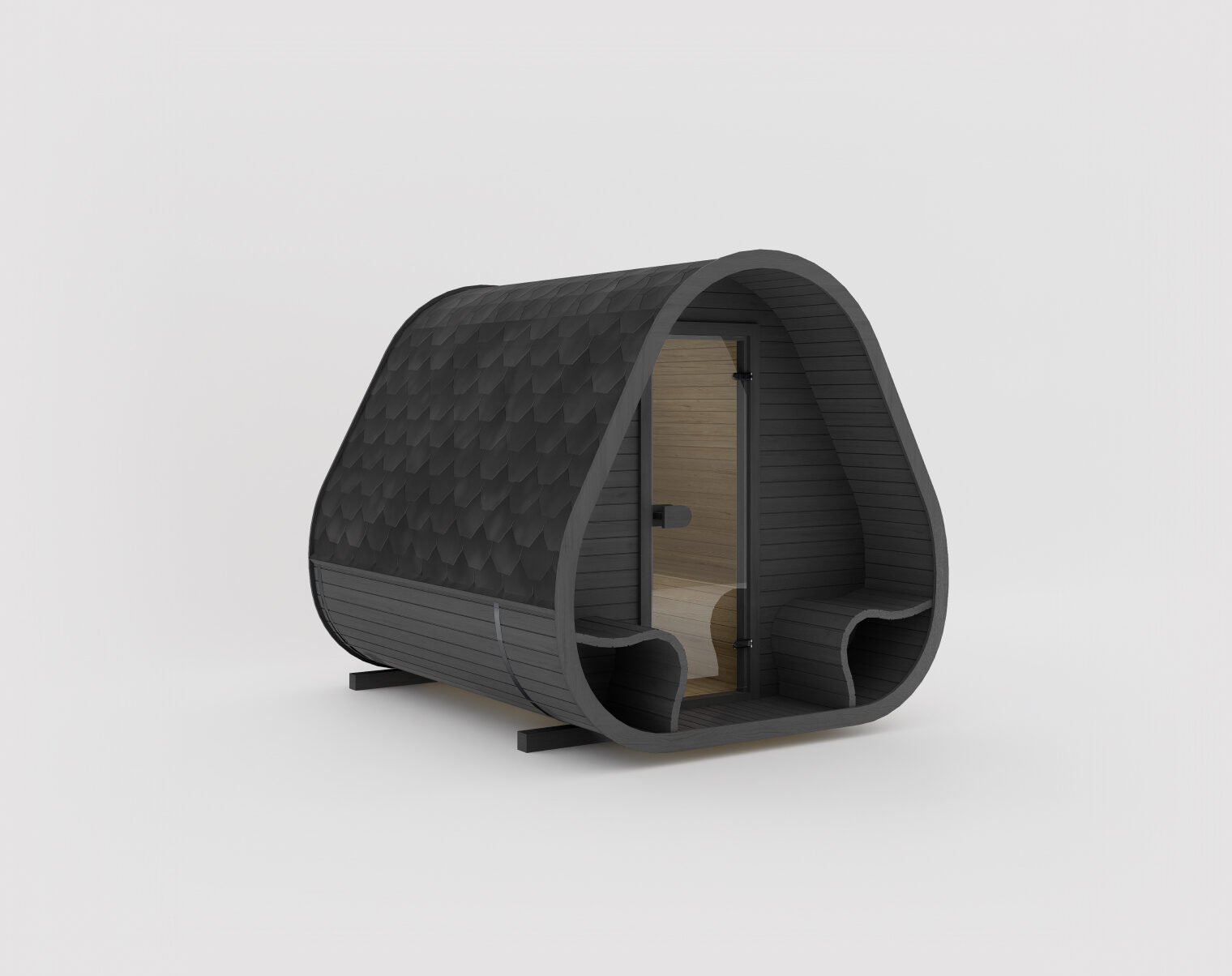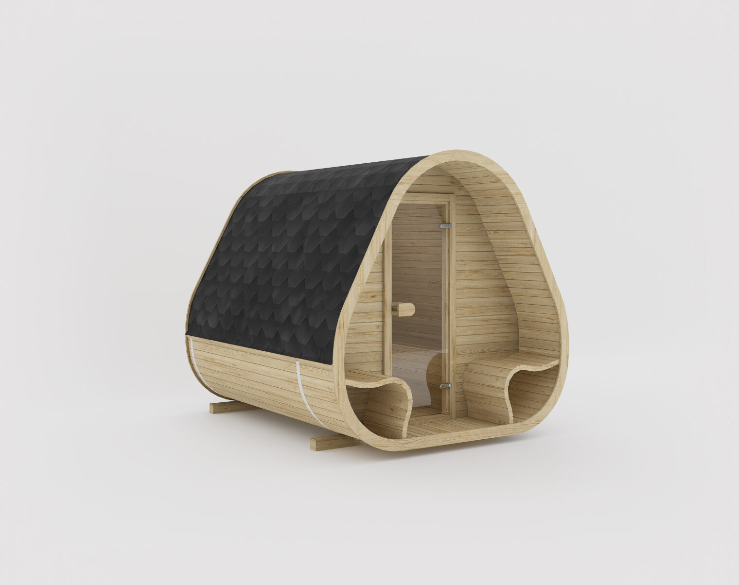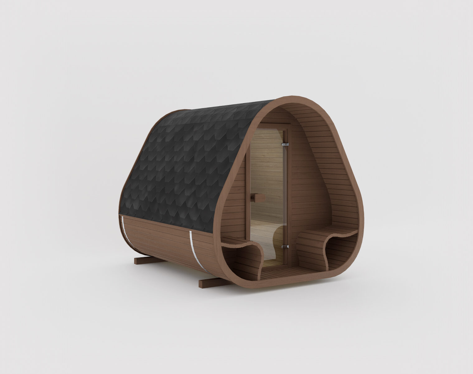 The Grand model builds on the same rounded triangular shape as Herkus Classic but adds an external vestibule, merging modern design with timeless elegance. This extra space not only enhances comfort but also elevates the overall aesthetic, creating a sophisticated yet practical sauna experience.