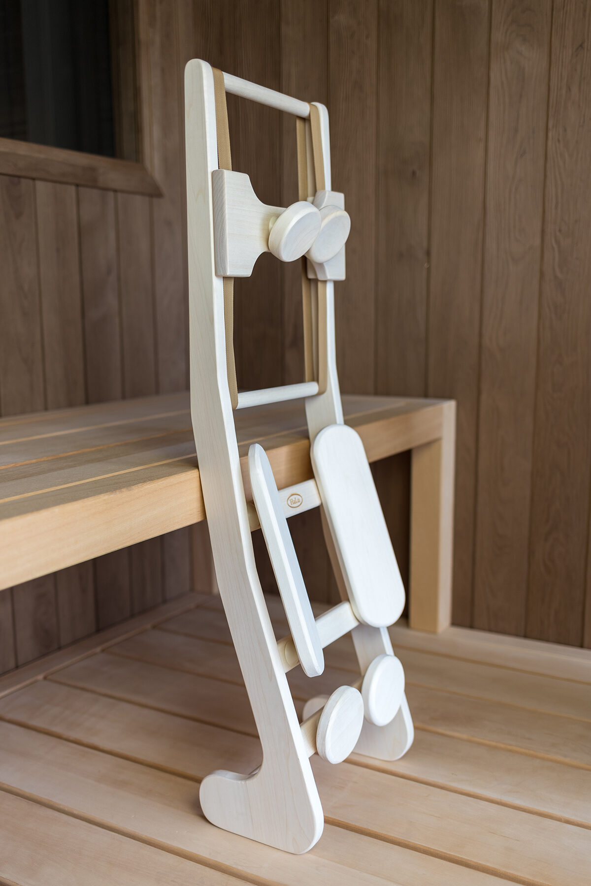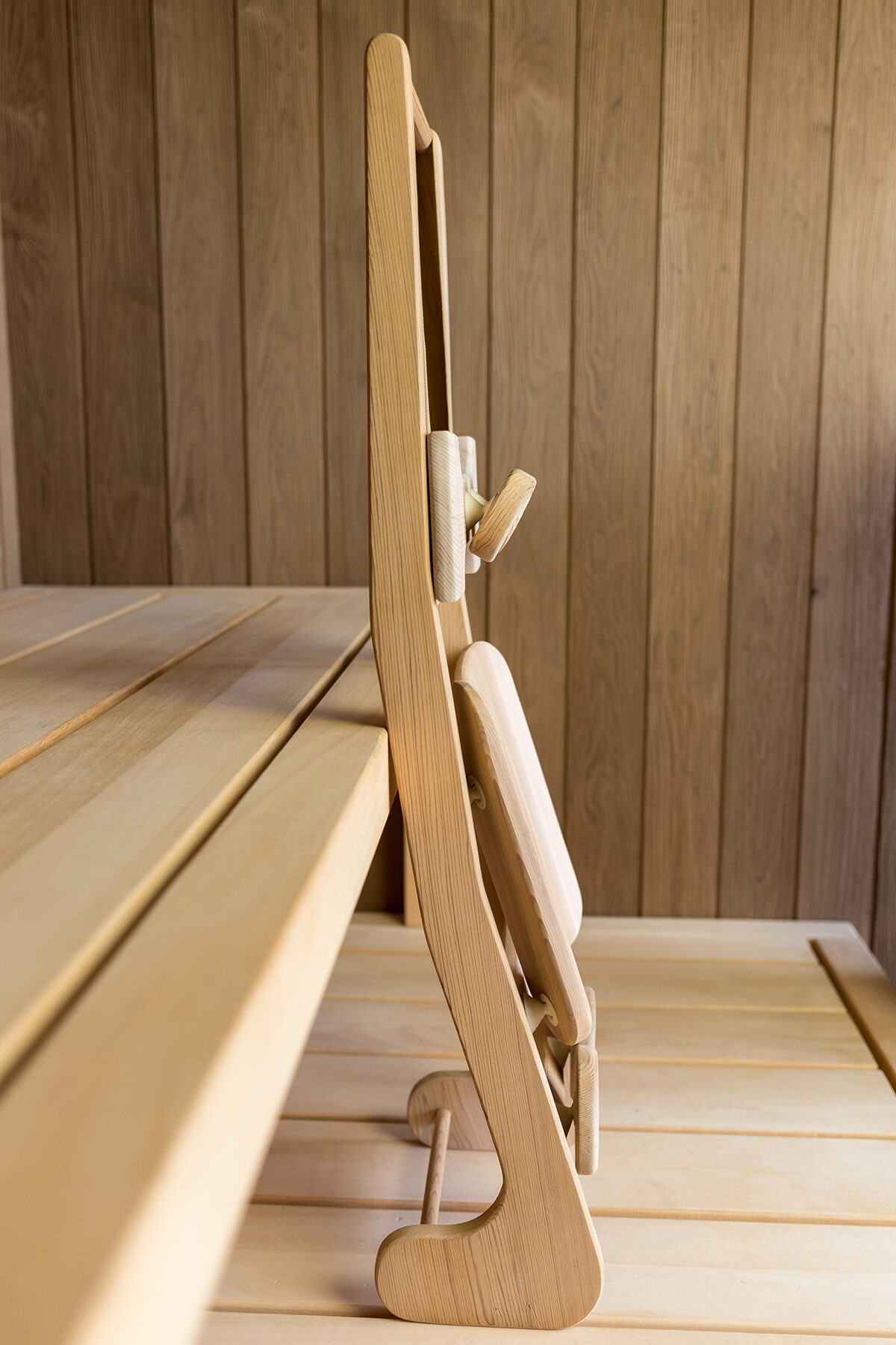 - Its flowing shape promotes the ultimate state of relaxation, whether in a Finnish or infrared sauna.