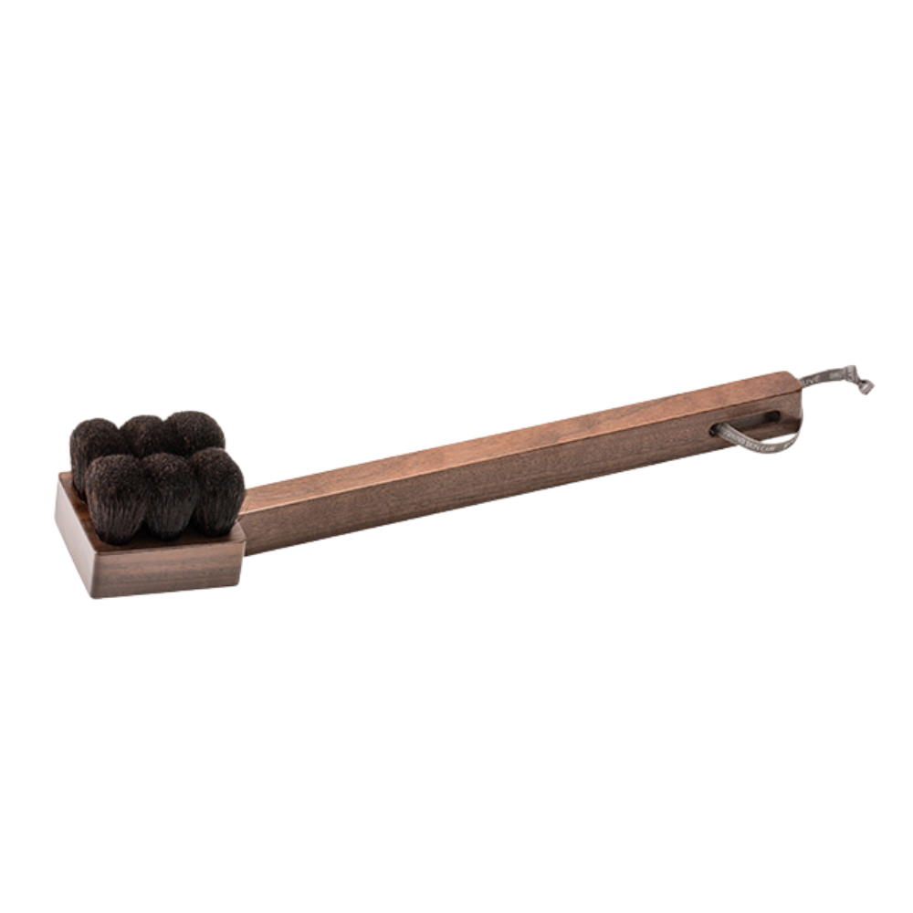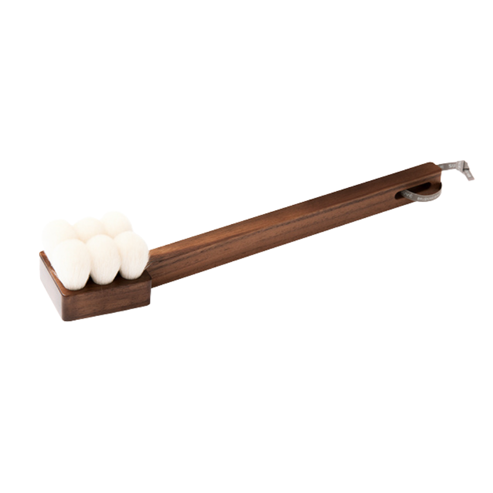 - Inspired by the form of a traditional Japanese ladle, the angled handle allows effortless reach across the back and body. Crafted from black walnut, it offers a warm, comfortable grip, transforming daily skin care into a calm and refined moment of self-care.