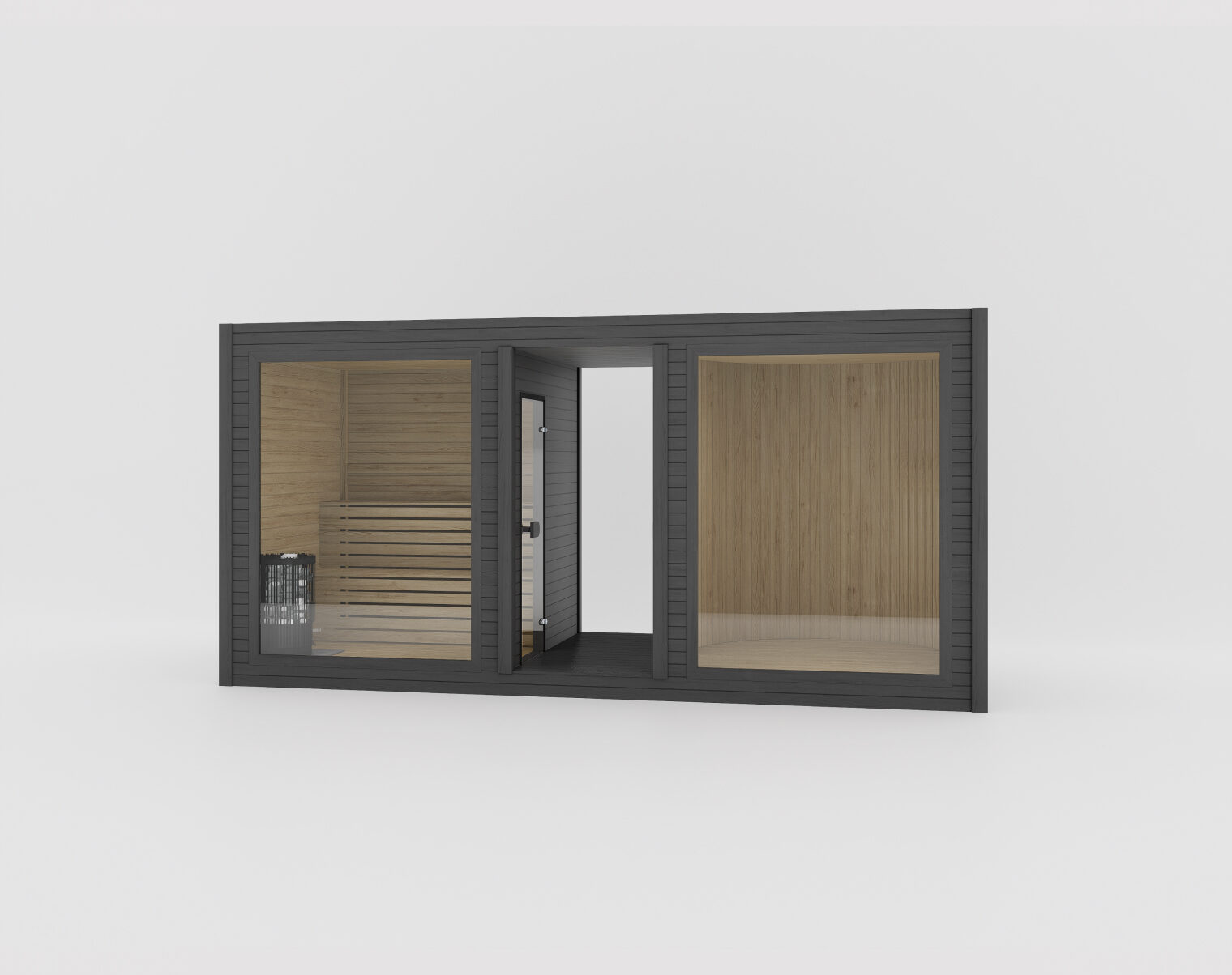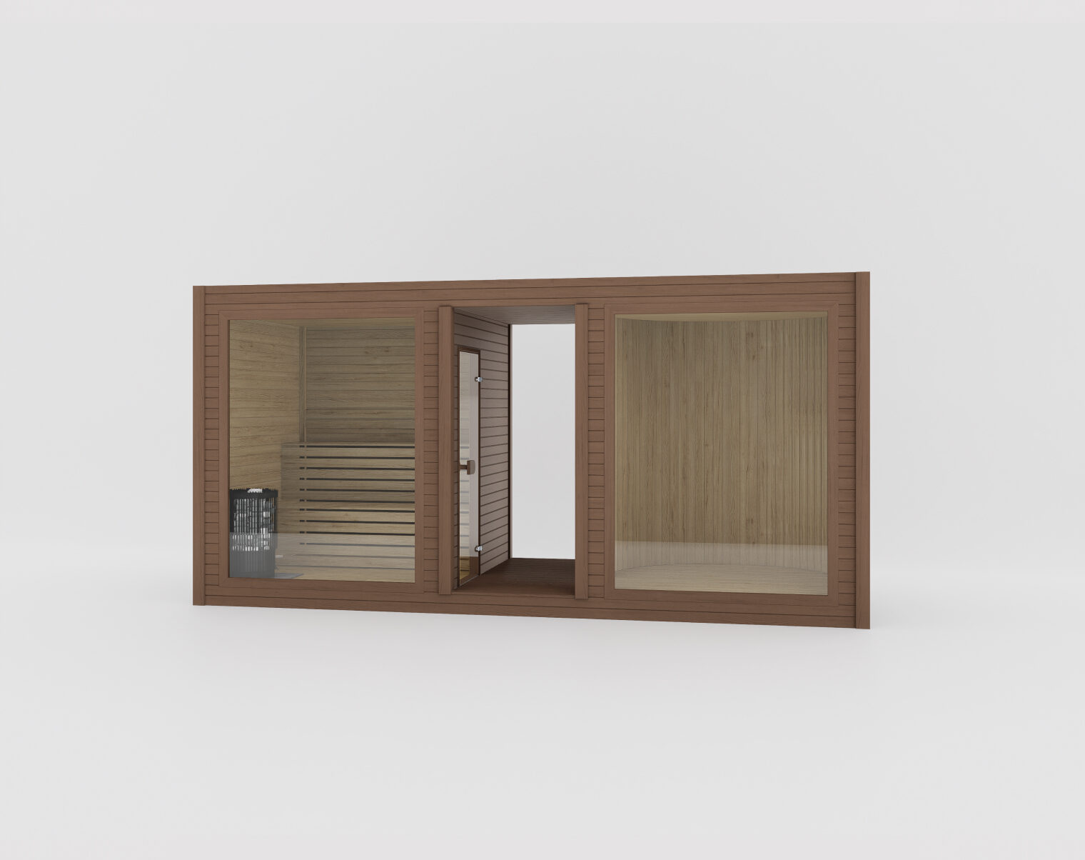 Tauras Modular View elevates the modular spa experience with the addition of a large front-facing glass panel. One end features a sauna module, while the other can remain open or be fitted with an integrated hot tub or whirlpool, offering flexibility to suit your space and lifestyle. Sleek materials define the View model, making it an excellent choice for scenic locations.